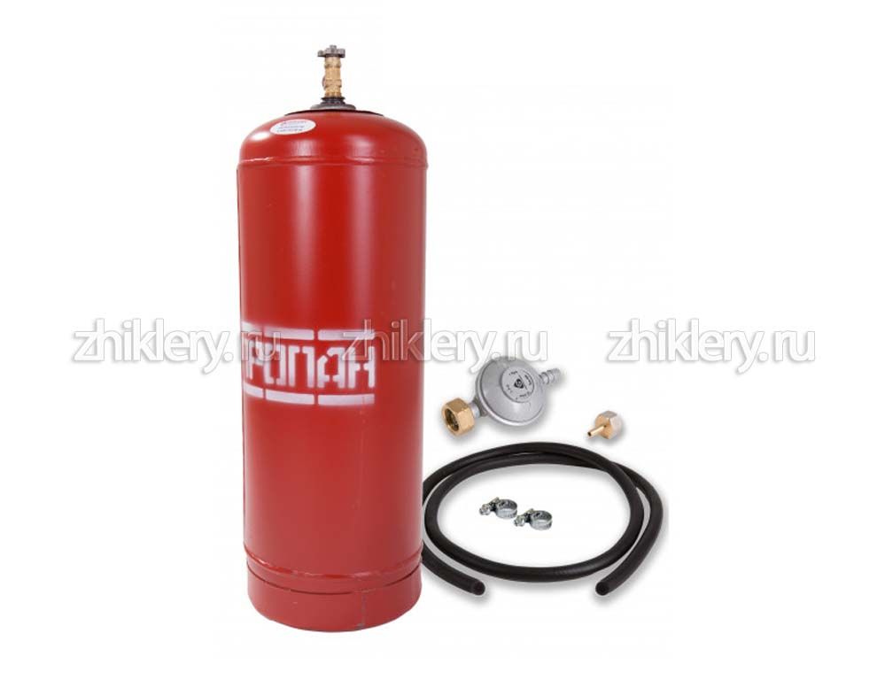 Баллон пропановый 50л 1шт. Редуктор Cavagna 30 мбар 1шт. Шланг Россия 2 метра 1шт. Хомут 12-18 2шт. Переходник для плиты 1/2" 1шт. -